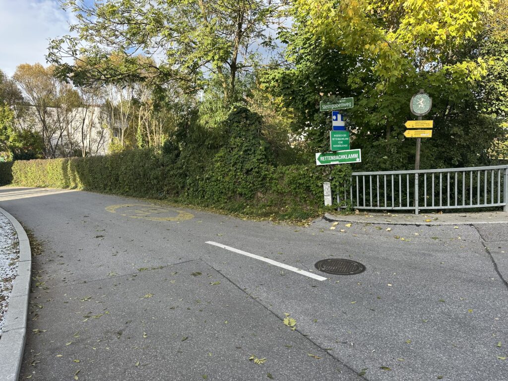 Nach Mariatrost fahren die Buslinien E1 und N1 von Graz aus. Diese halten beide bei der Haltestelle Waldhof/Rettenbachklamm direkt an der Hauptstraße. Von dort gehst du noch ein kleines Stück geradeaus weiter und siehst dann auch gleich schon linker Hand die Abzweigung in den Steingrabenweg. Dort weißt dich auch ein Wegweiser auf die Rettenbachklamm hin. Das ist die kürzeste Variante um die Klamm zu erreichen. Hier gehst du nur 700 Meter bis zur Klamm, du sparst die also 50 Meter im Vergleich zur Bim.