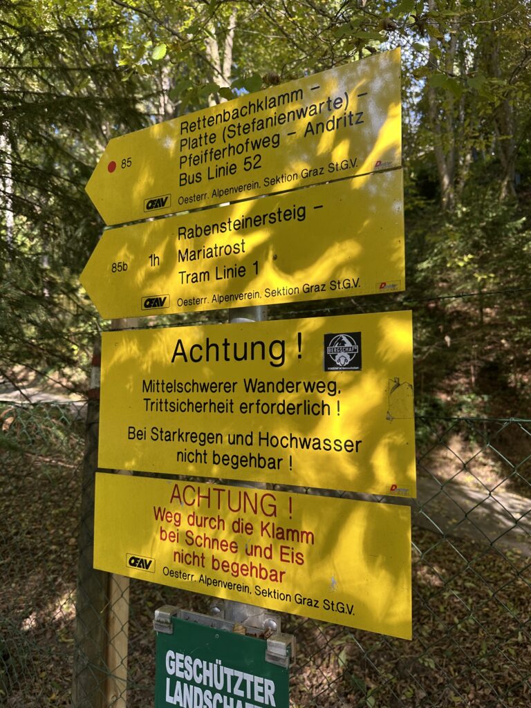 Die Rettenbachklamm liegt in Mariatrost, also noch im Stadtgebiet von Graz. Du kannst also keine alpine Hochtour in der Rettenbachklamm erwarten. Andererseits solltest du die Klamm auch nicht unterschätzen und als Spaziergang durch den Park abtun. Offiziell ist die Rettenbachklamm als mittelschwerer Wanderweg eingestuft. Trittsicherheit ist also absolut erforderlich! Darauf weisen auch immer wieder mehrere Schilder in der Klamm und am Klammeingang hin. Der Weg durch die Klamm ist mal breiter, sodass man auch zu zweit nebeneinander gehen kann. An anderen Stellen aber auch wieder nur ein schmaler Pfad, etwa in Schulterbreite. Hier kannst du auf dem Steig nur hintereinander durch die Rettenbachklamm gehen. Hier findest du alles Weitere zur Wanderung durch die Rettenbachklamm!